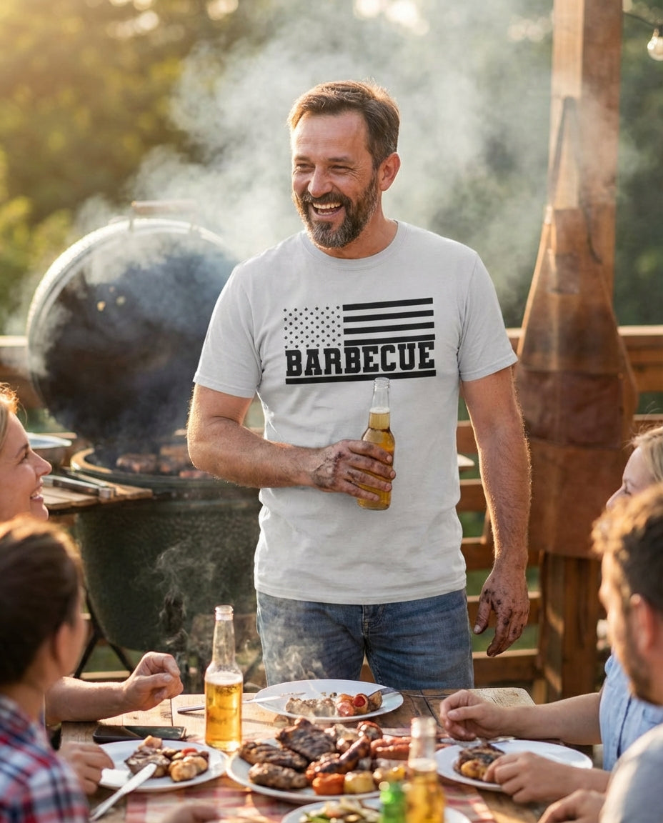 We build our shirts and hoodies the same way we cook — low stress, high standards. Soft enough to wear all day. Tough enough to handle a little smoke and sauce. Printed and shipped right here in the USA. Because if we’re putting our name on it, it better hold up longer than the party.